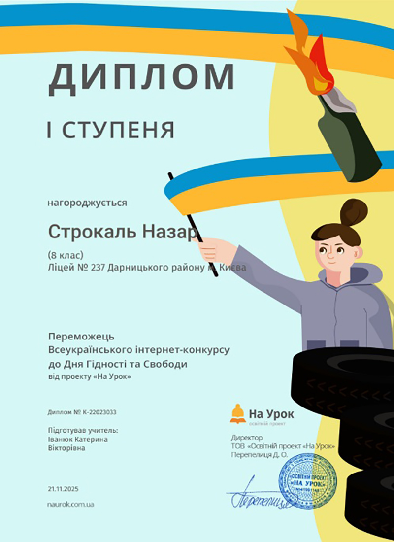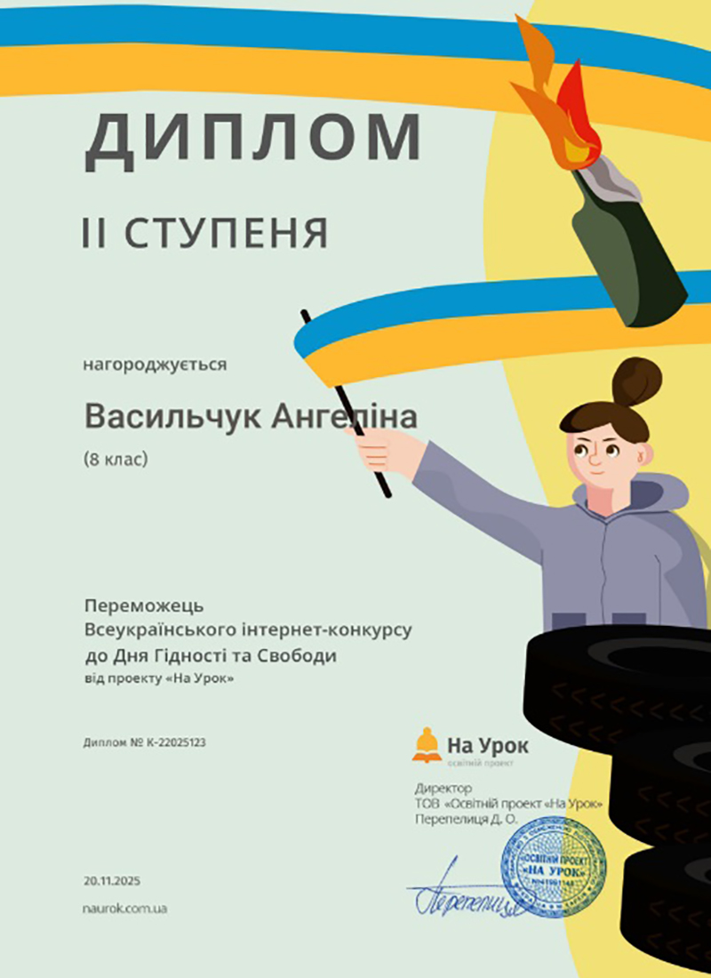 21 листопада усі українці відзначають День гідності і свободи. Саме на цю дату припадали події, які змінювали хід нашої історії, коли народ відстоював своє право на вільний вибір і демократичні принципи. Сьогодні, в умовах повномасштабної війни, це особливо важливо, адже український народ знову демонструє стійкість і вірність своїм ідеалам. До Дня Гідності і Свободи у ліцеї пройшли тематичні виховні години та уроки мужності «Україна — територія Гідності і Свободи», а учні 8-х класів взяли участь у Всеукраїнському конкурсі до Дня Гідності і Свободи від проекту «На урок». |